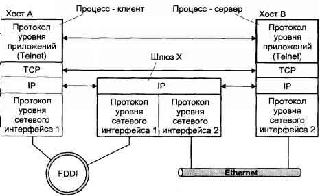 Заметим, что каждый интерфейс такого хоста-шлюза имеет собственный адрес, соответствующий той сети, к которой он непосредственно подключен. Например, для сетей с разделяемой средой передачи сетевая часть этого адреса равна адресу сети.