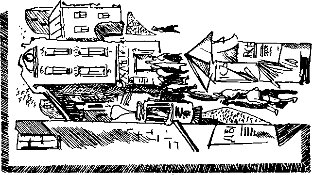 — Ложи-ись! Бросаю гранату! — громко кричит высокий стрелок и, когда машина приближается к митингующей толпе, размахнувшись, бросает в нее... консервную банку. Раздаются крики, истерические вопли.