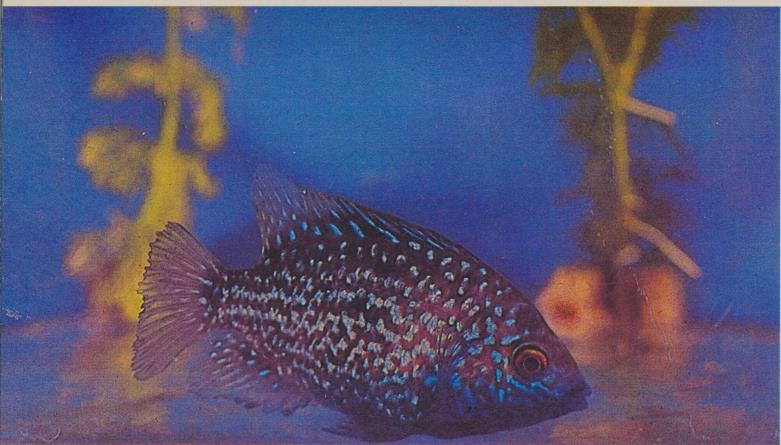 Распространена в водоемах Панамы и Колумбии. Достигает в аквариумных условиях длины 10 см. Окраска тела коричневатая с поперечными темными полосами и множеством мелких голубовато–зеленых пятен. Содержатся акары в аквариумах емкостью не менее 60 л с температурой воды 21 – 23 °C. Имеют относительно миролюбивый характер, но с мелкими рыбами их лучше не содержать. Цз растений рекомендуем сажать: эхи- нодорусы, криптокорины, кувшинки, людвигию. Разведение рыбок несложное. Для этого пару взрослых рыб помещают в нерестовый аквариум емкостью не менее 80 л со «старой», смягченной водой и поднимают температуру до 28 – 30 °C. Они строят гнездо и ухаживают за мальками, которых первое время кормят пылью, переходя постепенно на мелкого циклопа.